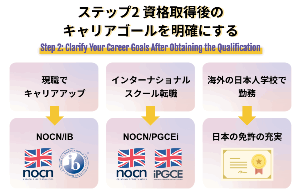 インターナショナルスクールへの転職を目指す場合、英国系の教育資格である「NOCN Diploma」や「PGCEi」が国際的に広く認知されており、有力な選択肢となります。また、IB(国際バカロレア)認定校を目指す場合は、別途IBの認定資格(ワークショップ修了)も有効です。まずは「ステップ2 資格取得後のキャリアゴールを明確にする」でご自身の目標を再確認してみてください。