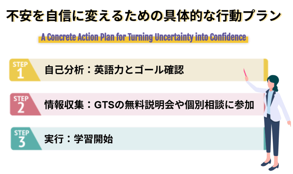 次に、そのゴールを達成するための情報収集として、GTSの無料説明会や個別相談を活用してください。そこで得た情報を基に、「NOCN Level 3から挑戦しよう」「まずは英語力育成からだ」と具体的な計画を立てるのです。小さくても具体的な行動を一つ起こすことが、不安を解消する何よりの特効薬です。