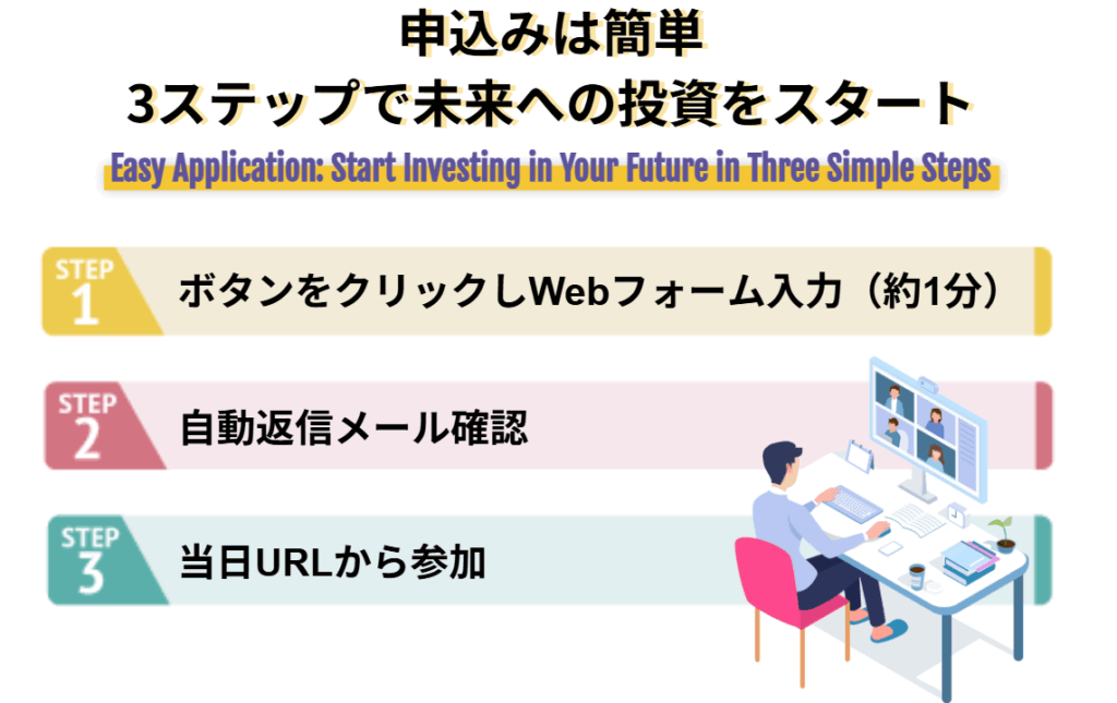 あとは、当日にメールに記載されたURLをクリックするだけで、ご自宅のPCやスマートフォンから気軽にご参加いただけます。この小さな一歩が、あなたのキャリアを大きく変える「未来への投資」のスタートです。