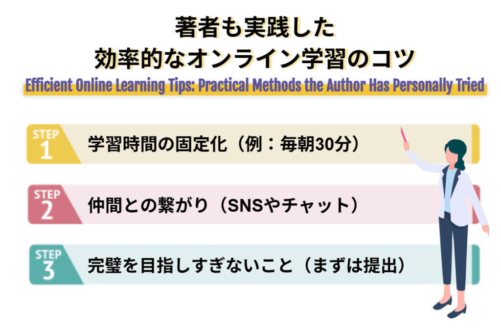 私自身も働きながらCELTAやNOCNの資格を取得しましたが、オンライン学習の鍵は「継続」です。モチベーションを保ち続けるために、私が実践していた3つのコツをご紹介します。