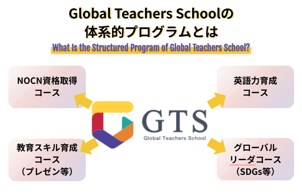 メインとなる「NOCN資格取得コース」の他に、英語力が不安な方のための「英語力育成コース」、指導スキルを磨く「教育スキル育成コース(プレゼン等)」、視野を広げる「グローバルリーダーコース(SDGs等)」を整備しています。資格取得という「点」ではなく、国際教育者としてのキャリア全体を「線」でサポートするのがGTSの役目です。