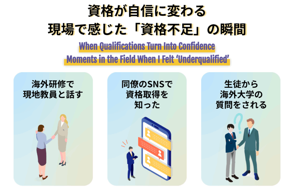 また、生徒から海外大学のカリキュラムについて質問された際、自信を持って答えられない自分に気づくこともあります。その「資格不足」という感覚こそが、次のステップに進む原動力です。国際資格は、その感覚を埋めるための最も具体的な行動となります。