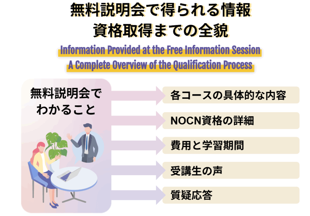 まずはお気軽に個別相談会へご参加ください。この説明会では、この記事でお伝えした内容をさらに具体的に、分かりやすくご説明します。例えば、「NOCN Level 3とDiplomaの課題の違いは?」「実際のオンライン学習画面はどうなっているの?」「受講生の平均的な学習時間は?」といった、皆さんが本当に知りたい情報を網羅しています。もちろん、その場で直接ご質問いただく時間も設けています。漠然とした不安を解消するためには、まず「知る」ことが第一歩です。