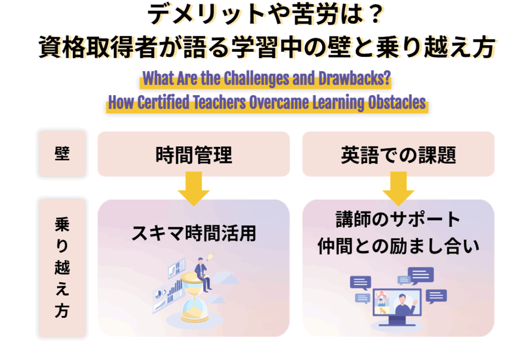もちろん、良いことばかりではありません。資格取得者が共通して語る「壁」は、主に「時間管理」と「英語での課題」です。働きながら毎週の課題をこなすのは、想像以上に大変です。特に、英語で教育理論のレポート(アサイメント)を書くことに苦労する方は少なくありません。