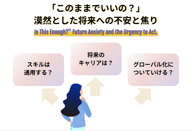 多くの先生方が、現在の仕事にやりがいを感じつつも、将来に対する漠然とした不安を抱えています。その根本的な原因は、変化の激しい時代の中で、今のままでいることにリスクを感じ始めているからです。例えば、生徒から海外大学の進学について質問された際、自信を持って答えられなかったり、SNSで海外で活躍する同僚の姿を見て、自分だけが取り残されているような焦りを感じたりすることはないでしょうか。