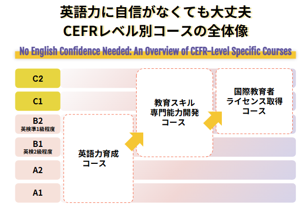 当スクールの最大の強みは、受講生一人ひとりの英語力(CEFRレベル)に応じて、最適な学習ルートが明確に示されていることです。英語力にまだ自信がない、という先生も全く心配ありません。