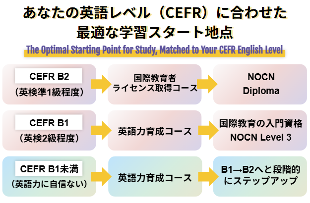 一方で、B2レベル以上(英検準1級以上)で、より高い専門性を目指すのであれば、本格的な国際教育者ライセンスの取得を視野に入れることができます。もし英語力にまだ自信がない場合でも、全く心配いりません。私たちGlobal Teachers Schoolでは、資格取得に必要な英語力を基礎から体系的に育成するコースも用意しています。無理なく、無駄なく、あなたにぴったりのスタート地点から、着実にステップアップしていくことが成功への一番の近道です。