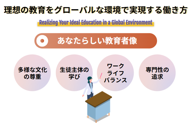 日本の教育の良さを世界に発信し、同時に海外の優れた実践を日本に持ち帰る。そんな、日本と世界の教育を繋ぐ架け橋のような存在として、あなたはかけがえのない価値を発揮できるのです。