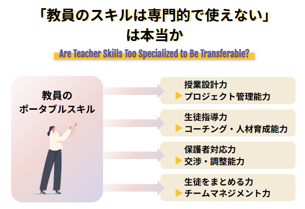 「教員のスキルは学校の中でしか通用しない」というのは、よくある誤解です。結論から言うと、あなたが日々培っているスキルは、非常に汎用性が高く、どの業界でも高く評価される「ポータブルスキル」です。なぜなら、授業を計画し実行する力は、企業のプロジェクト管理能力そのものですし、生徒や保護者と向き合うコミュニケーション能力は、どんな職場の人間関係においても不可欠だからです。
